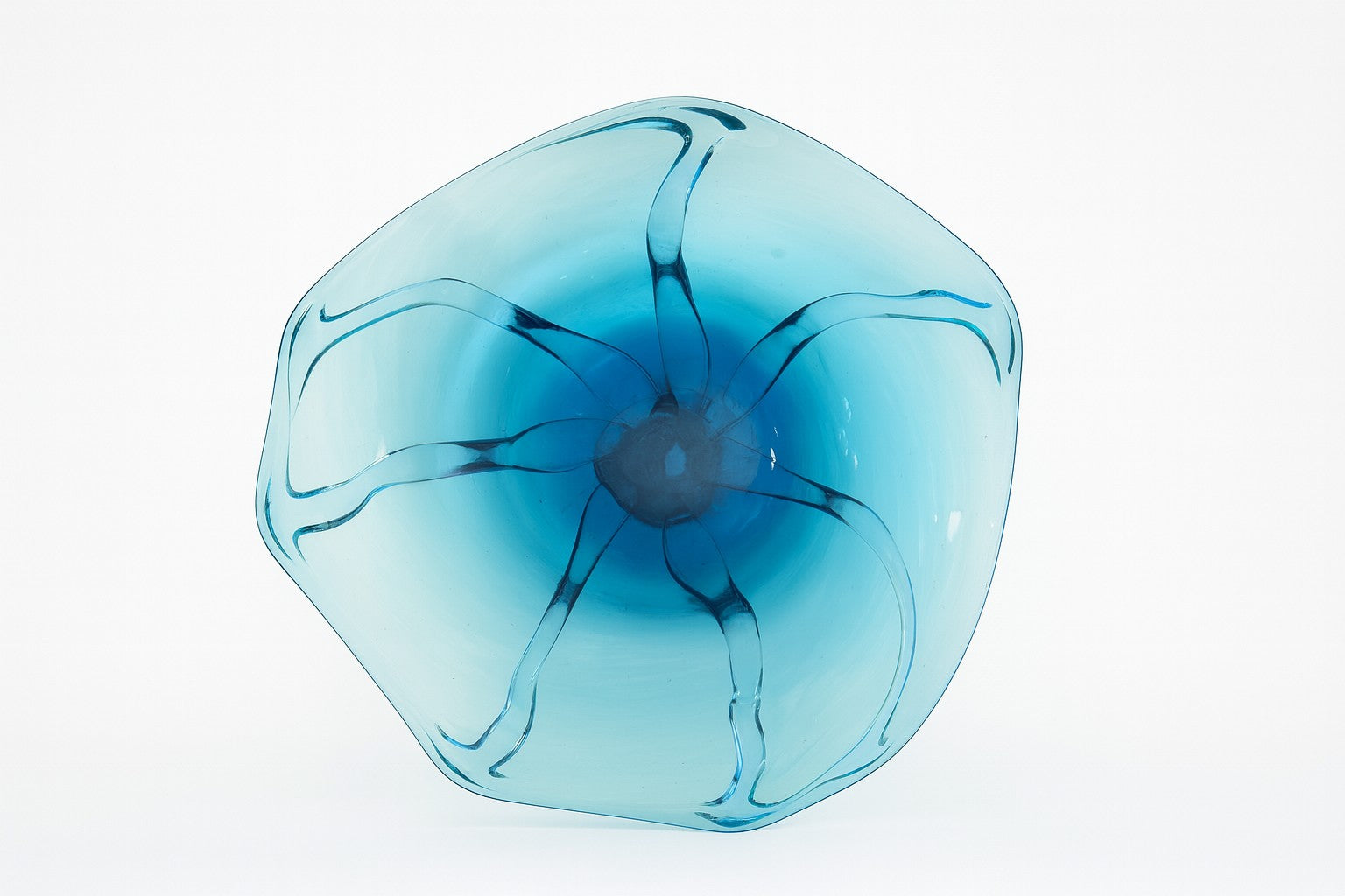 This eye-catching coastal centerpiece boasts a 19" diameter. Hand-blown in vibrant ocean blues, this sculptural glass bowl features fluid, wave-inspired contours that catch the light beautifully.